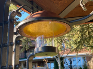 Detailaufnahme einer kunstvoll geschmiedeten Hängelampe für Kerzen mit Glaszylinder und vergoldeter Kupferschale.